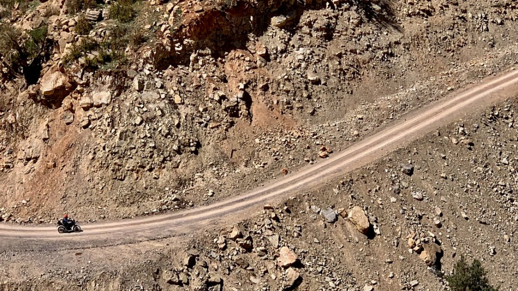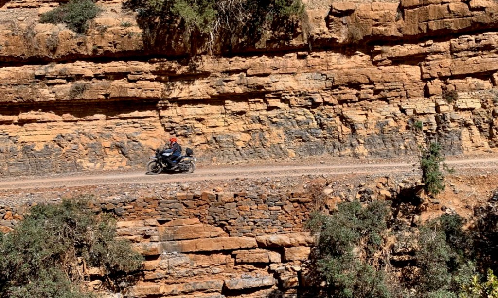 The last 40km into Anergui follows the precipitous Assif Melloul gorge (above; video below) with some big drops into the river you’d not want to attempt. Getting weary, I did overcook it a couple of times – perhaps the ABS led me astray.