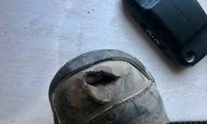 I even managed to poke a hole in the toe of my ageing TCX boots (left) without anything clouting the bike, far less spotting a sharp rock. I know the pegs are low, and sliding forward on the saddle points feet downwards, but this was a first for me. The wide gearing felt fine providing you kept it above 3000rpm. First was a tad tall as usual ~6-7kph @ tickover? – but clutch slipping and grunt pulled it round steep switchbacks.