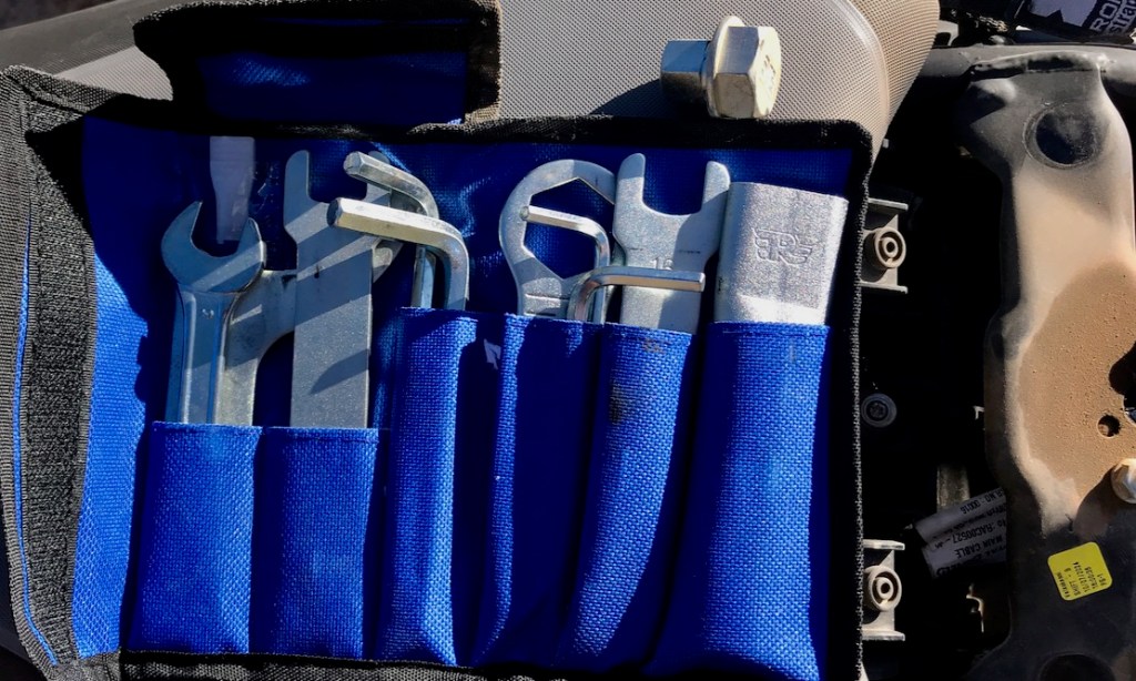 I checked for a toolkit and was amazed to find something resembling a 1970s BMW or MZ. Everything’s there (below left), including an adaptor nut to remove the front wheel with the rear wheel wrench. What a shame the rental shop didn’t think it through and import tubeless models; I’d have happily paid more. We borrowed a rear tube, expecting to need it. With the seats off, I also noticed the height adjustment pegs on the front saddle (below right). I left mine on high which is still pretty low.