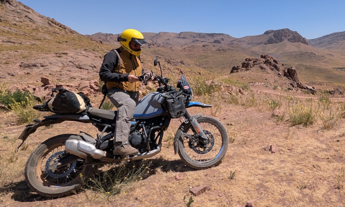 My MT was a bit juicy for a 450cc, plus I knew at first sight its size would limit solo off-road exploration, even with the low seat height. Luckily, I did loads of that the previous winter on the 300L for my new Morocco 4 guidebook from which I span off the Trans Morocco Trail. I missed my 300’s go-anywhere ability, even if crossing Spain was a slog. Could a Him 450 pull off both? We were here to find out. I was in Morocco with Jon. We last rode together in 2003 on Desert Riders out as far as the northern Tenere’s Lost Tree.