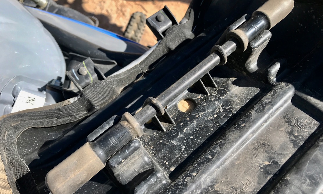I checked for a toolkit and was amazed to find something resembling a 1970s BMW or MZ. Everything’s there (below left), including an adaptor nut to remove the front wheel with the rear wheel wrench. What a shame the rental shop didn’t think it through and import tubeless models; I’d have happily paid more. We borrowed a rear tube, expecting to need it. With the seats off, I also noticed the height adjustment pegs on the front saddle (below right). I left mine on high which is still pretty low.