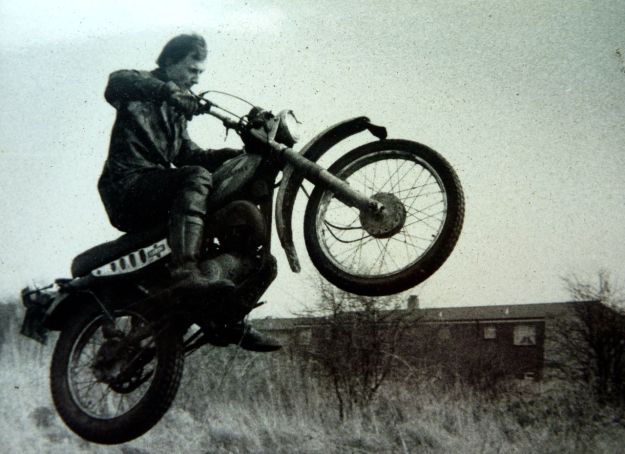 Like a 4×4 sand tyre, at very low pressures the thin sidewalls flex out to e l o n g a t e the tyre’s footprint, giving tank-track like traction. In the late 70s I remember doing a little enduro at Badgers Mount in Kent on my TS185 (above left and below). Against PEs, Bultacos and the like, I wasn’t a contender of course, but in the muddy woods at jogging speeds my trials-tyre shod TS had grip like no other tyre I’ve ever tried.