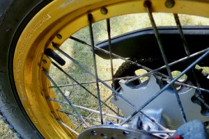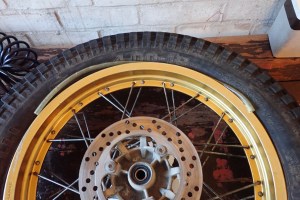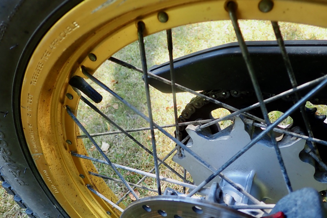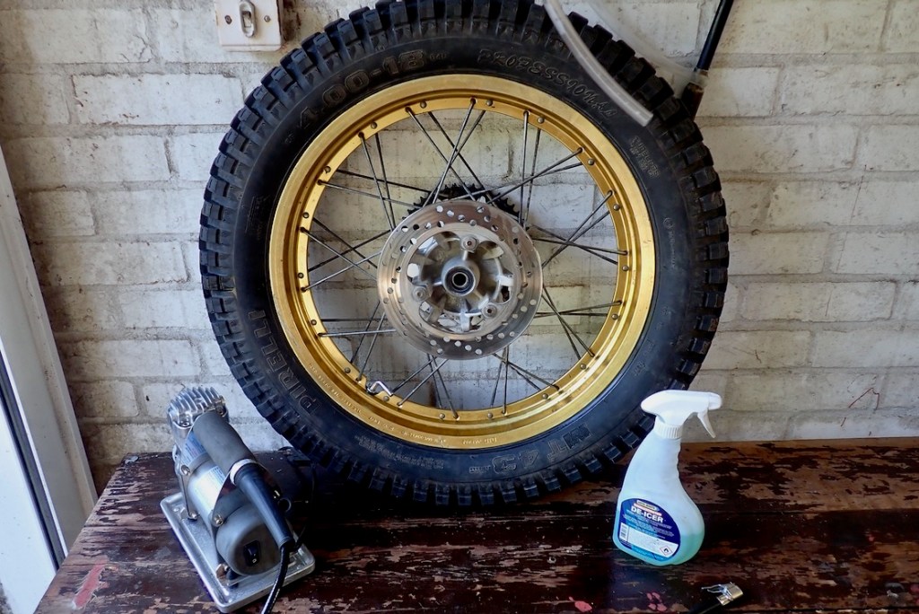 With the rear wheel off to check over and fit new bearings, I removed the Serow’s tubeless Pirelli MT43 trials tyre to fit a right-angle valve so as to end airline forecourt faffing once and for all. The Serow’s rear wheel only is an early example of OEM spoke tubeless. It’s even stamped with ‘tubeless tire applicable’.