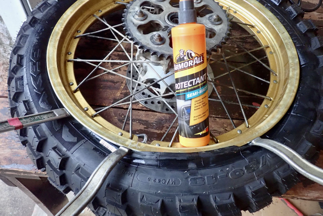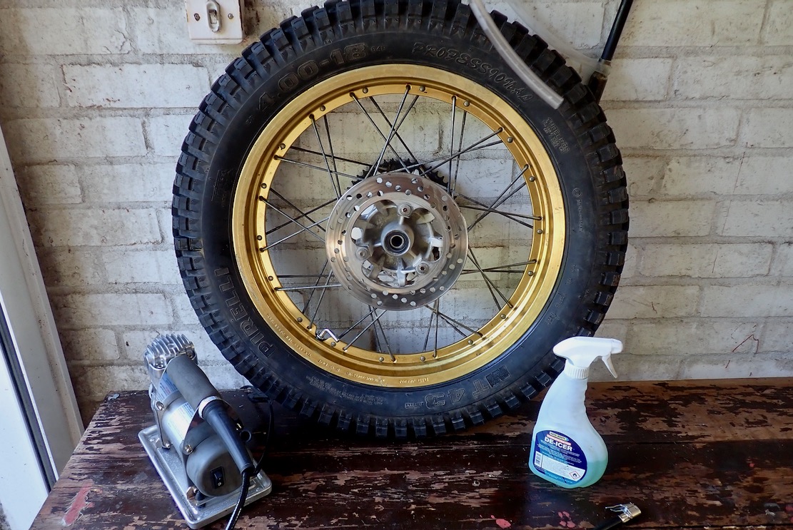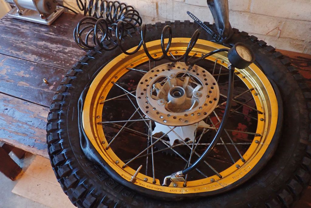 So I turned to the bicycle inner tube method which years ago worked on my Land Cruiser, fitting five tubeless tyres by hand in the back yard. Lay the wheel rim flat on a bench so the tyre is unsupported and the lower bead presses down onto the rim’s lower edge. When a moto wheel rests on its disc rotor or sprocket, this happens anyway. That should get the lower tyre bead to press or at least rest on the wheel rim, reducing air loss.