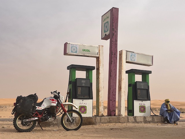 Looks like a hot, dusty day somewhere in Mauritania, probably the roadhouse midway to Nouakchott which doesn’t always have pump fuel. The Moorish bloke on the right sets off the symmetry with the bike as well as the two green pumps – probably the only greenery for miles. The pinkish haze over the dunes reflects the maroon signage mast. It’s the desert at its least glamorous: choking, dreary hot middle of the day but with the vital fuel to keep the show on the road.