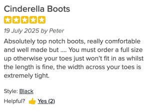 I didn’t get the chance to read before buying but many reviews and customer reviews on SBS (left) testify to this. But had I gone up a size to 47s they’d be way too long. I’ve had width issues forever with hiking boots, but with the Sidis the pressure goes away after a while, and it’s not like I’m heading up the Pennine Way with a full pack for a fortnight. If they’d been that bad I’d have put them straight back on eBay and might even have made a few quid.
