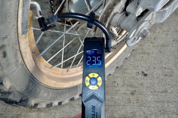 Fully charged out of the box, I inflated the new rear Michelin Wild tyre on my Serow from empty to 26 psi in 2:38s. The gadget vibrated a bit but didn’t get too hot. The battery dropped to ¾, but recovered back to full four bars in a few minutes.