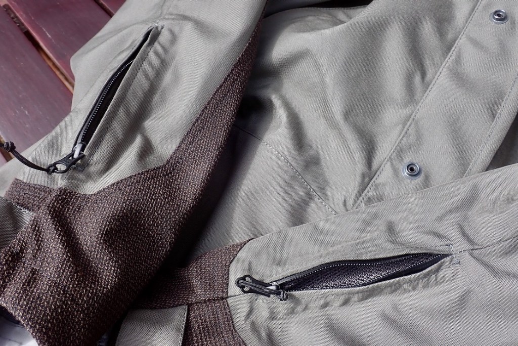 The 500D, grey nylon body fabric is an abrasion resistant, 3-layer bonded laminate, sandwiching a no-name membrane. That’s the best way to do it, compared separate zip-in liners found on cheaper gear which I like to think have had their day. Oddly, the contrasting woven, 240D kevlar reinforced polyester abrasion panels are also 3-layer. You’d think any simple, tough abrasion-resisting patch would do, and in fact according to the AS table, this 240D is less abrasion resistant than the plain old 500D shell fabric (which is how Aerostitch do their impact-area patches), but helps add a textured look to the jacket. This additional layering will improve water resistance but reduce breathability. It also means these impact-prone areas get no less than seven layers of protection if you include the armour pads underneath. You’re elbows, back and and shoulders will be well protected from impacts.