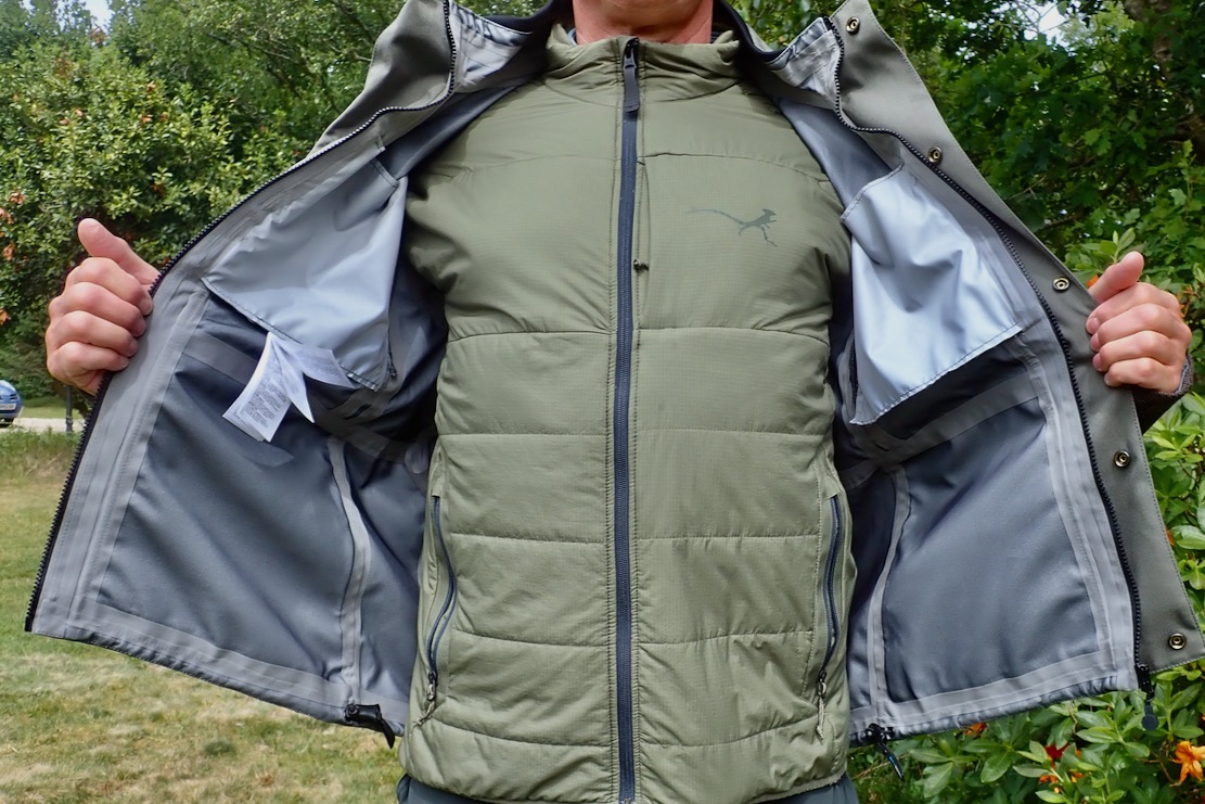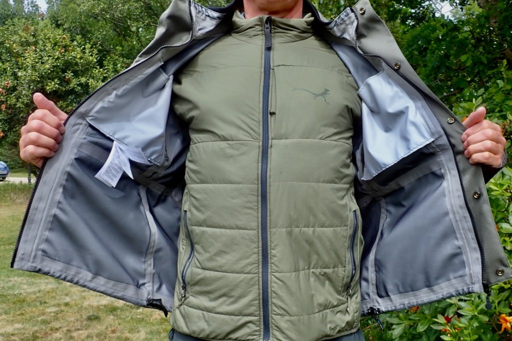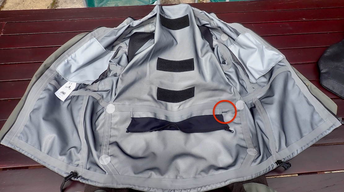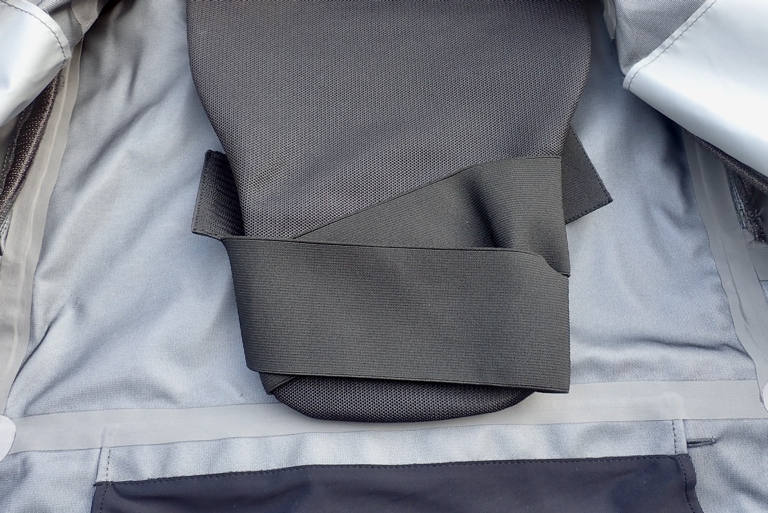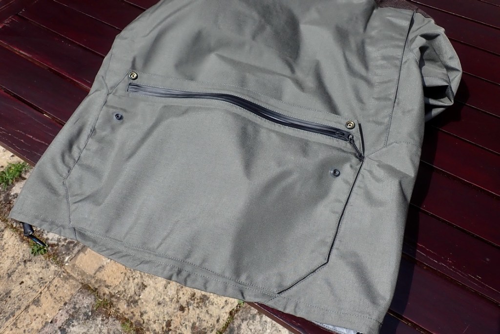On the back is a huge ‘game pocket’ with studs over another water resistant zip. I find pockets like this a handy place to stash essential but rarely needed items which you never want to be parted from. It’s a long time since I’ve been as supple as Olga Korbut, but I was able to open both poppers and slide the zip while wearing the jacket. They don’t mention it, but inside the game pocket is a buttonhole slot to feed out a long hydrator hose. It would have to come out around the neck – close enough to your mouth – but means you can dispense with wearing a hydrator daypack, another clobber ‘win’!