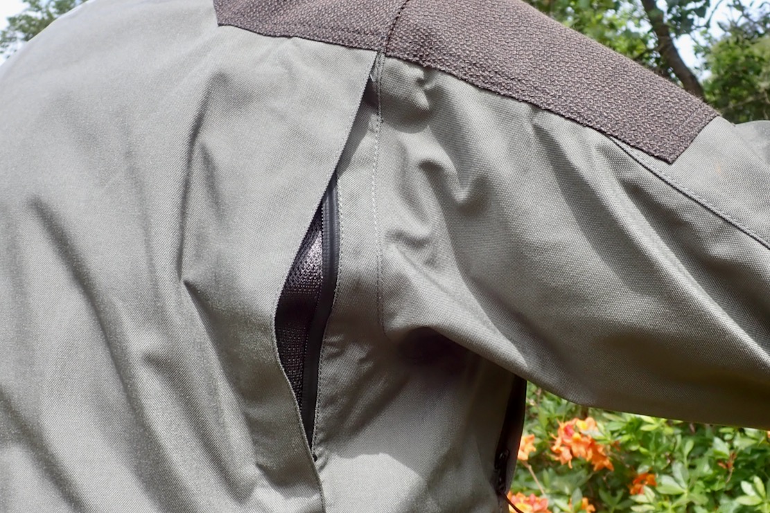 Venting air flow looks a bit constricted on the Gravel, but then I’ve not actually tried it. On the forearms you have a couple of short, mesh-backed zip vents (above) which it’s hard to see being very effective. There’s another set on the upper sides of the chest with exhaust vents on the shoulder behind (below left and right).