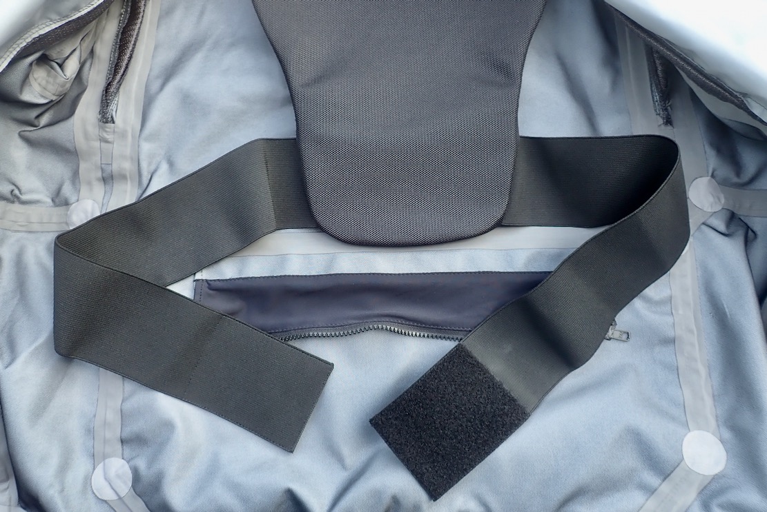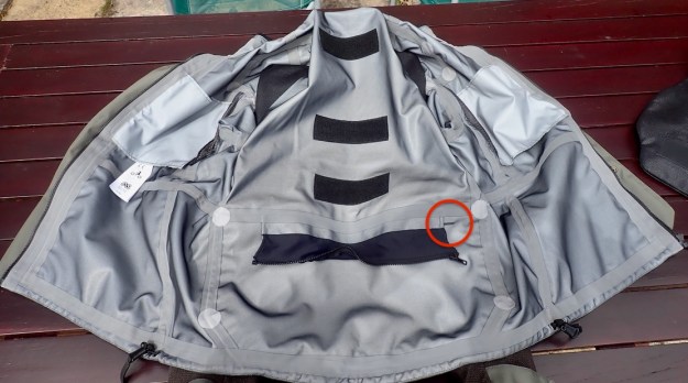 Pockets add up to a couple at the hem (below left), and another pair outside on the chest but behind the poppered storm flap (below right) which means you don’t need to open the main zip to access them. Water-resistant zippers up here mean that a passport, wallet and phone ought to be well protected from downpours, but condensation in a pocket may add humidity.