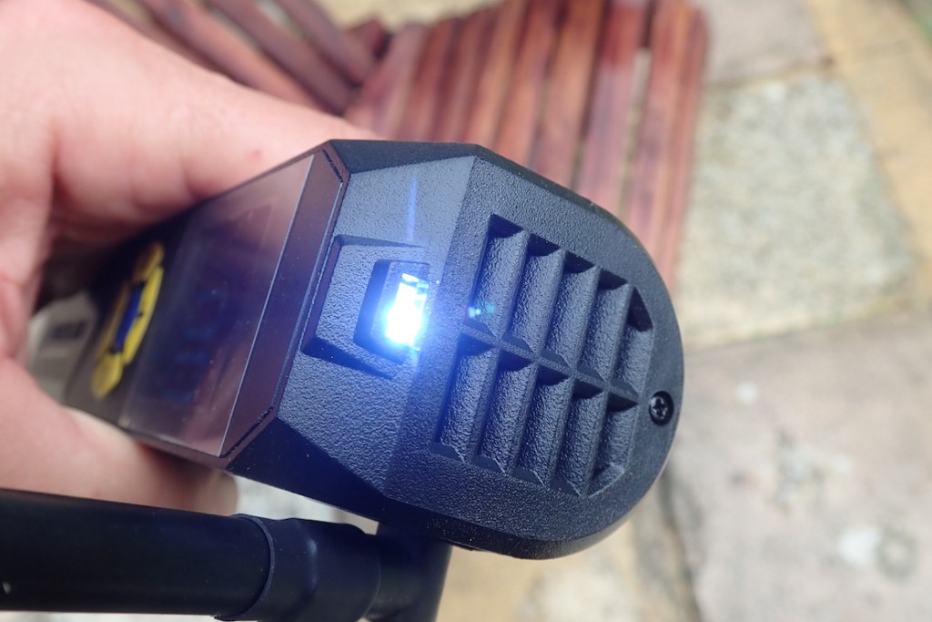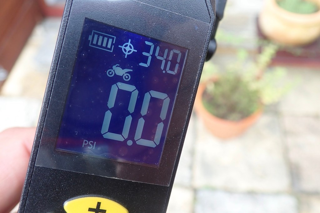 Jabbing the blue button won’t work. You wake it up by swinging out the hose at which point the LED lights up and the thing is live. Only then does the blue button set it off. You can scroll through four fixed-psi presets (bike 45, moto 34, car 32, football 8psi). It says adjustable which is true but that doesn’t mean ‘storable’ afaict. There’s a fifth, empty one to set as you like. But that isn’t stored either. I did read the leaflet and tried a few times. This all reminds me of the TPMS glitches (see below). Or maybe it’s as it was supposed to be But honestly, you don’t really need presets. Just clip on, hit the blue button and watch the numbers rise to the pressure you want. Then hit the blue button again and it stops.