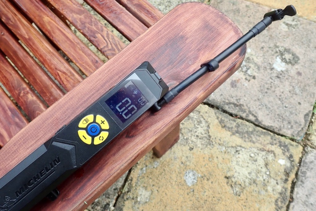 REVIEW My £20 ebay cheapie died after two years, longer than expected. And the bulk and faff of my ancient, 12-volt wired Cycle Pump remains off putting. Once you go wireless it’s hard to go back. Bring on the day when all electrical household items are cable-free! I like to think the 20% saving right now at Halfords on the Michelin Mini Rechargeable Inflator covers the extra you pay for Michelin branding. The handy pump is about 8 inches or 20cm long, and comes with a tiny LED ‘phone’ light, and adapter nozzles for pushbike Presta valves and a football clipped to the swing-out hose with a fold-lever tyre valve connector. Plus there’s a flimsy bag.