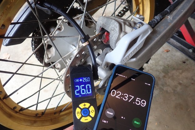 Fully charged out of the box, I inflated the new rear Michelin Wild tyre on my Serow from empty to 26 psi in 2:38s. The gadget vibrated a bit but didn’t get too hot. The battery dropped to ¾, but recovered back to full four bars in a few minutes. All in all, so far so good. I hope it does better than the flakey Michelin branded TPMS I tried a few years ago. The rear factory tubeless wheel on the Serow tends to leak on some tyre combos, so the easy-to-use pump may be getting more use in Morocco this winter.