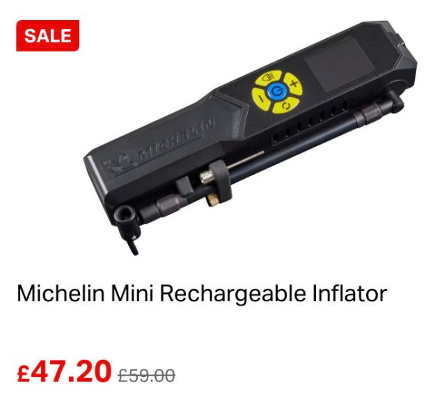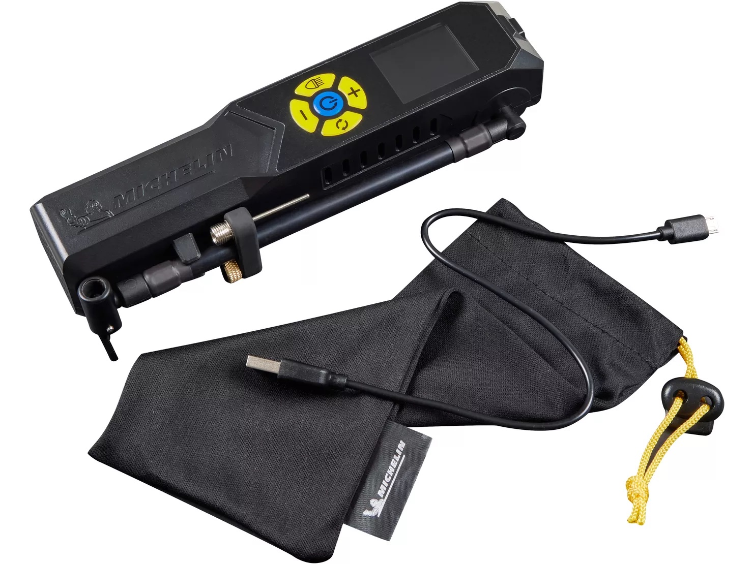 WHAT THEY SAY Compact design fits in the glove box. Designed for topping up tyre pressures. Digital gauge is accurate to +/- 1 PSI up to 50 PSI. Switchable between PSI, BAR & KPA. Cordless, lightweight and portable, the Michelin Mini Rechargeable Inflator is remarkably easy to use. With four programmable pre-set pressure settings the cordless inflator is ready to inflate bicycle, motorbike and car tyres as well as a sports balls and other small leisure accessories. It’s [sic] integrated lithium battery is rechargeable in aprox. 3hrs. Built-in high intensity LED light at the top, enables for use in emergency or low light situations.