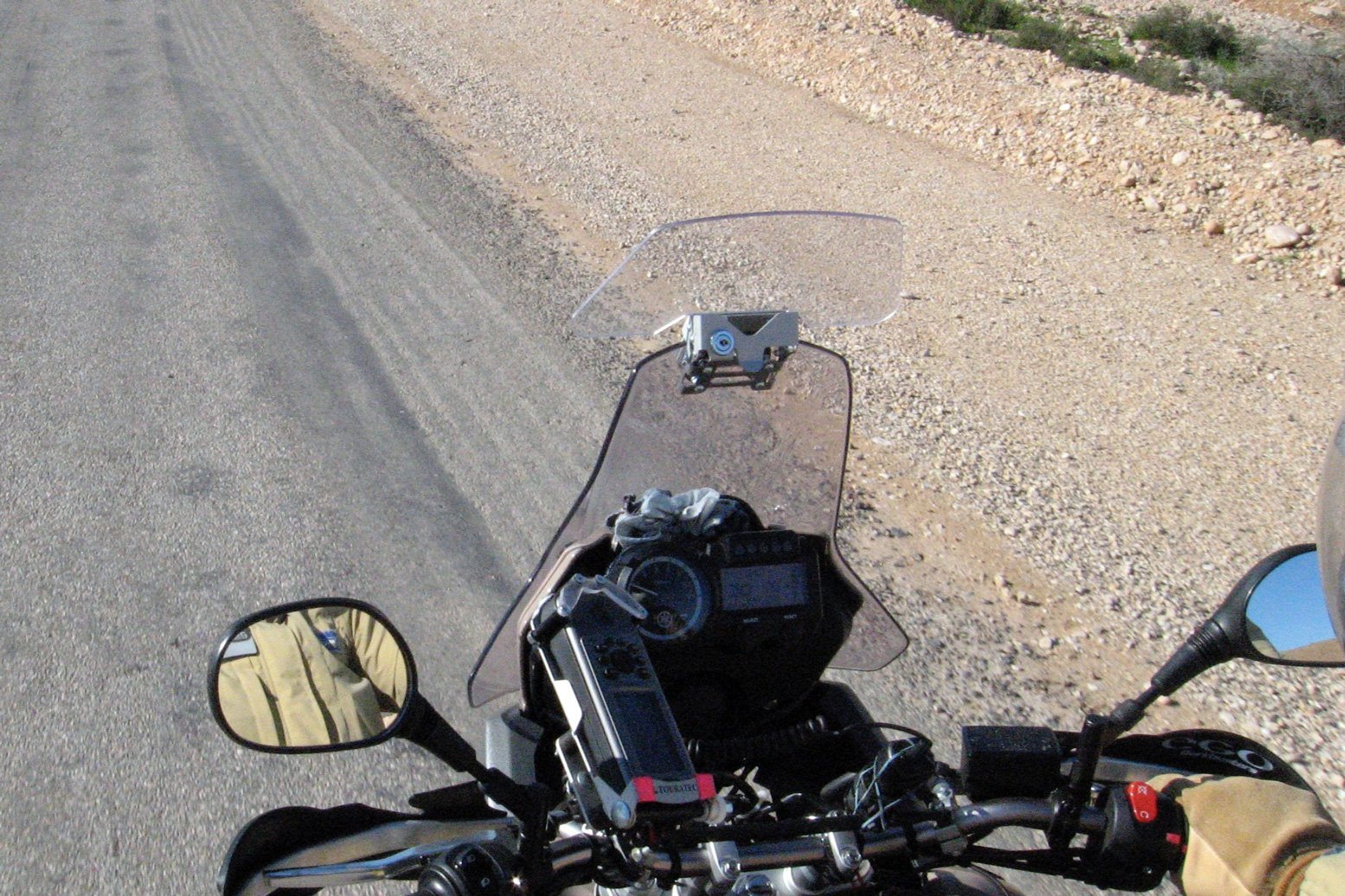 Road riding Generally on the road I sit at an indicated 65mph or so – not so fast. At this speed riding is less tiring and safer and economy is good. With the screen extension this could be sustained all day with only the usual discomfort. Many road testers used to brilliant GSXR’s and the like don’t get on with the handling of 21”-wheeled trail bikes and in response many manufacturers chose 19” fronts for their bigger adventure bikes. They have a point: a 21”shod bike never feels planted in the bends and adding a semi-knobbly tyre doesn’t help. Fwiw, I felt the bike handled pretty well on the TKCs. On the highway they didn’t feel any worse than the original Tourances used for running in, though I don’t exactly throw the XT around like a super moto. Loaded up, I found the bike was sometimes hard to turn on tight bends and hairpins, both on or off road, as if the front was raked out too much or the weight was too high (it is). Short of getting your weight over the front end, MX-style, the usual way to tune this out is to soften the front- or jack-up the back. I don’t recall having this impression on previous bikes like this; they’re usually too softly sprung. So I blame the higher than average CoG (centre of gravity) not helped by the cats stuck way high out the back, along with my high luggage set up, and the firm suspension. If I’d kept the bike I’d have experimented with softening the springs and even lowering the bike (and possibly getting rid of the heavy twin cats for a lighter pipe). To be fair, some of the roads and tracks in Morocco are very narrow and tight, with thought-provoking drops. Even some tarmac mountain back roads have strips of gravel down the middle on which any bike would struggle to progress smoothly.