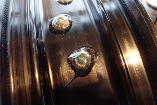 The 19-inch wheel arrived so I got stuck in but rushed it. I didn’t wait a day for the glue to cure, then fatally used slippery 303 UV Protectant to help mount the very stiff AX41. Works great on tubed wheels but I suspected it was a bad idea for MYO tubeless. Once mounted, when I spotted 303 bubbling out of a spoke thread I knew the game was up.
