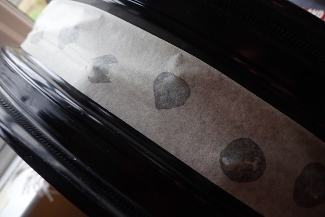 With 30 quid well spent, the tyres came out the shop rock hard. But would they stay that way? No, the two fronts were losing air. Casting aside seal damage during mounting, what were the chances of 104 blobs and 3 valves all being perfectly sealed? Only about 98% it seems. I turned the leaking wheels slowly through a trough of water and isolated a leaking spoke on each. I marked the spokes and whipped off the tyres, much easier now they’d been pre-flexed at the shop.