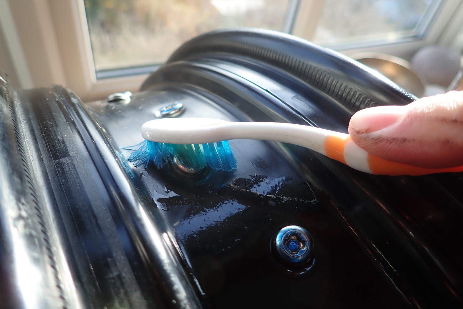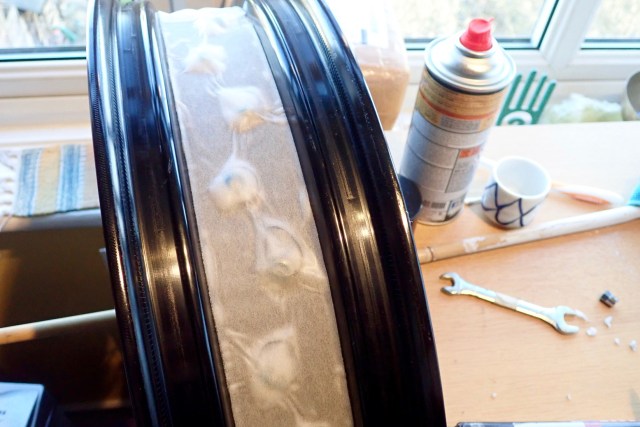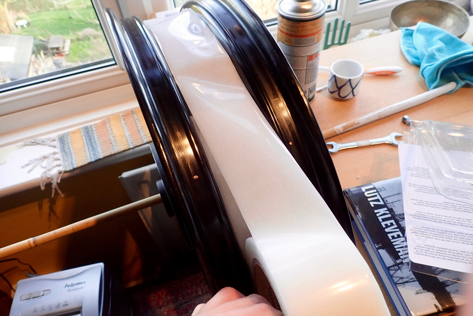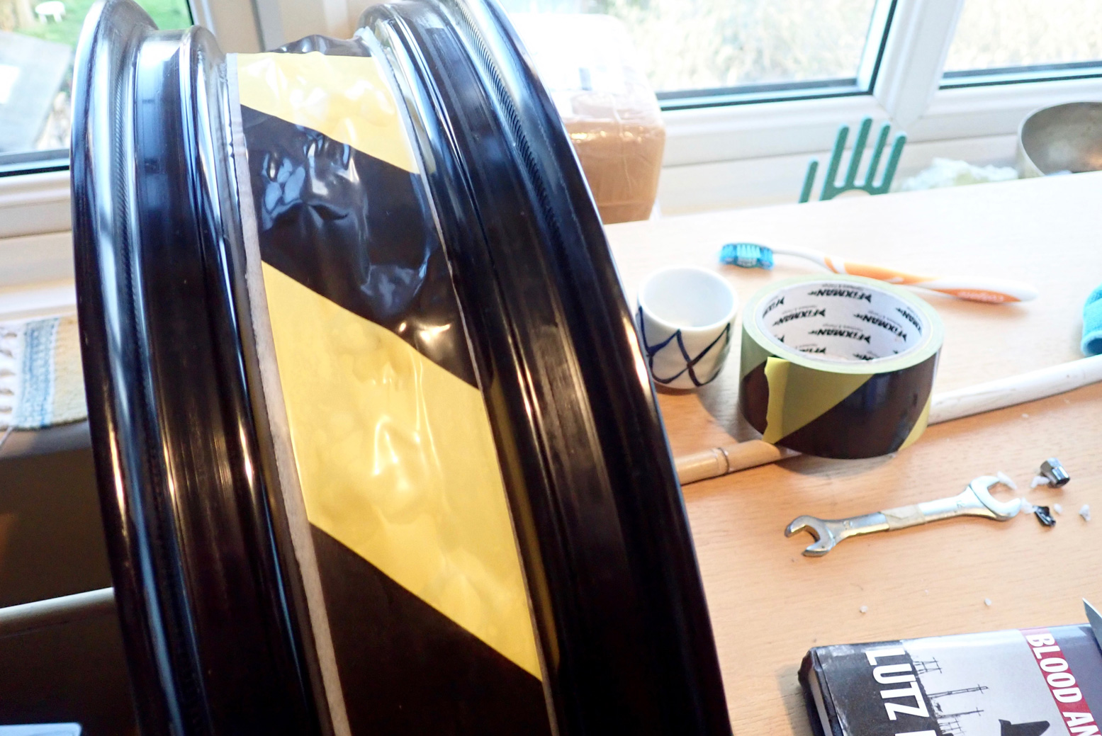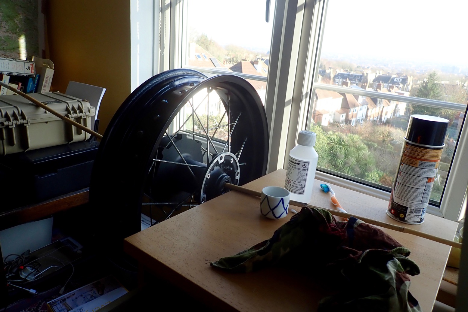 Next day I needed to get my ducks in a row. Typically for me, I wasn’t repeating the proven system from the Africa Twin, but trying a new idea suggested by a mate. I spent a couple of hours in Poole sourcing components and by the time I got back, the other two wheels had arrived. After cleaning the 303 off yesterday’s mess, I started over.