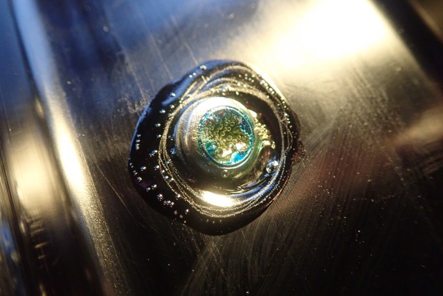 On the 19er I spotted a millimeter wide hole in the Puraflex (left) which the dab of Superglue underneath had also not sealed. I’ve not used Puraflex before – it’s not like a bathroom sealant and is PU, not silicon, based. Not sure what that means – the stuff was good and hard but had shrunk a bit as it dried. Perhaps the hole had opened up on curing, or perhaps I should have inspected each blob with a magnifying glass or given them all a pre-emptive second swipe of Puraflex once dried – that would take another day to dry. On the 21 incher I couldn’t see the hole under the corresponding spoke’s blob which underlines the idea of a second coat or even a continuous band. So I second-coated all the blobs and left it for another night. Weeks later the 21 (left at home) had lost just a couple of pounds so I’ll take that as a win.
