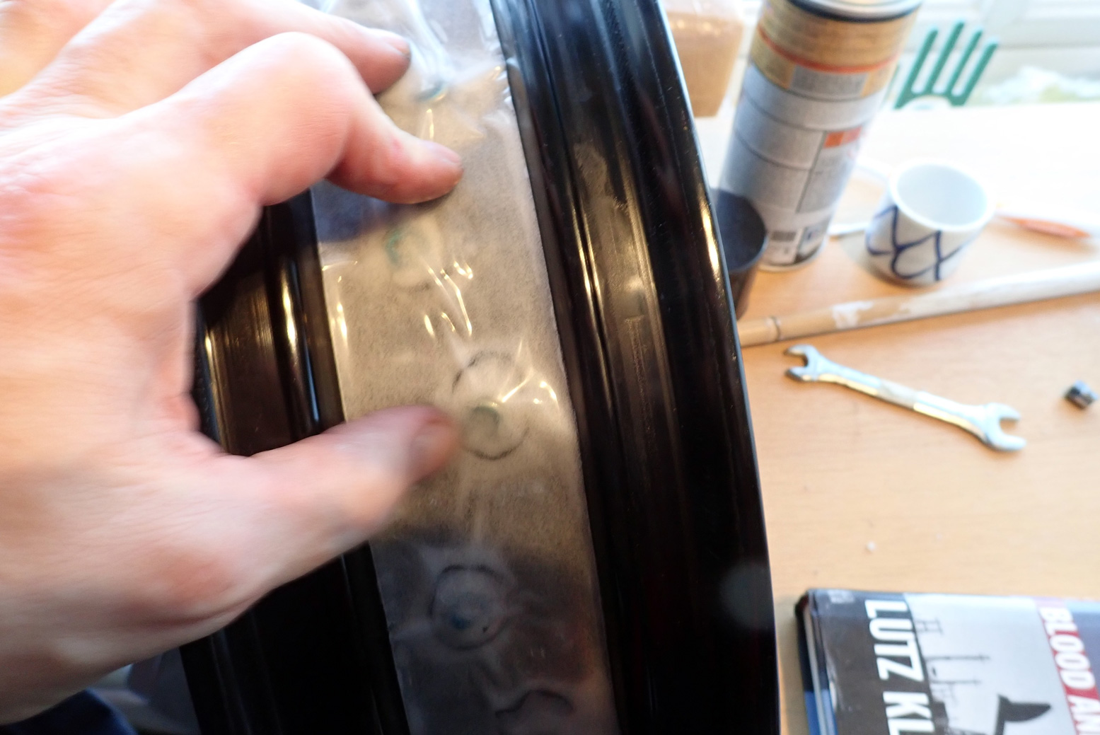 With the tyre off, my glue blobs had gone soft (left, from 303 contact?) and peeled off like soggy plasters. To be fair, one problem with this used 19-inch rim was that the pre-existent spoke holes (from a KTM?) had to be reamed and re-angled to fit the Honda hub. It made for bigger gaps so I tried to seal the outside of the nipples with Stormsure where water might run in, but should have done a better job all round.