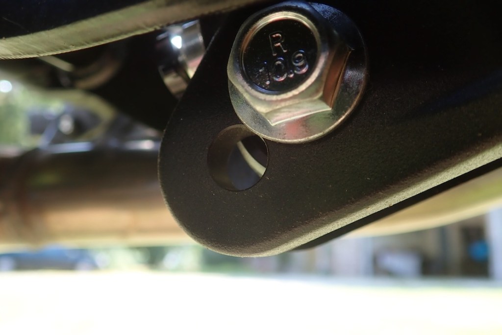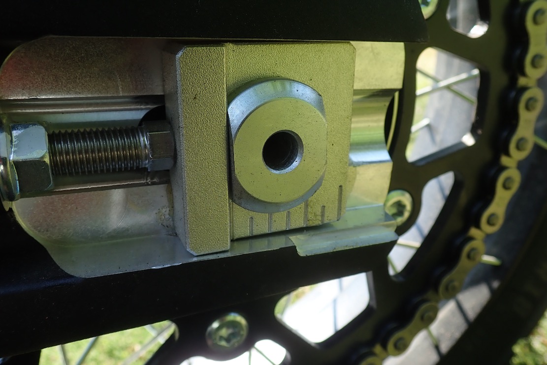 The rear linkage has a second hole (above right) to reposition the shock to lower the seat height. Such a simple and inexpensive idea: no need for aftermarket Schmouba links, thin seats, or seat-height adjustment: just drill another hole. And chain adjustment (above left) looks a whole lot easier to manage than the dumb 300L version.