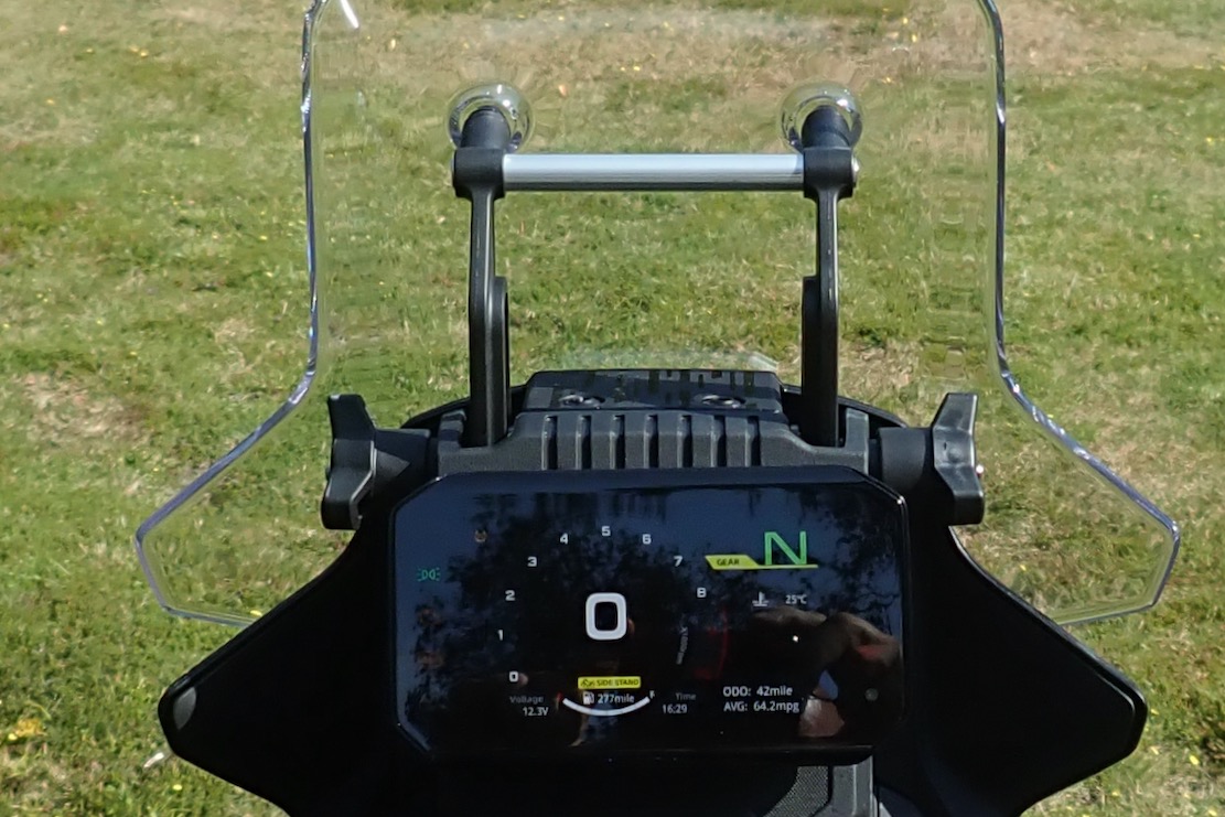 The numbers in white are a bit small to read, especially the useful clock when you got a ferry to catch. Actual engine temp is nice; the fan kicks in around 90°C. The fairing even has one of those rally-style 12mm bars to mount a nav device. I searched high and low for an adaptor for my Montana mount but in the end will just use a RAM off the bars.