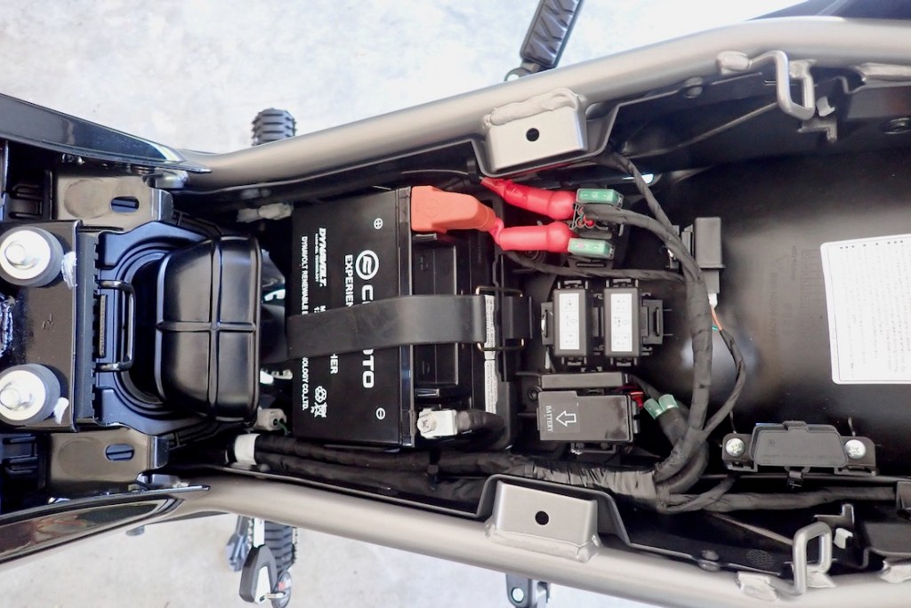Under the seat is all reassuringly neat, although my bike came with the battery not strapped down, and the toolkit and straps missing – the dealer eventually gave me some tools: the usual half-arsed combination of open spanners, allen keys and a two-ended screwdriver. Tools to adjust the chain, let alone remove a wheel, are not included (Rally Raid have one of their F&R TrailTool combos). Most of the missing tools are covered with my Motion-Pro Tool pouch. In the end I gave up on the dealer and bought the OEM C-spanner for the shock preload from China for 4 quid. It clips to the seat base.