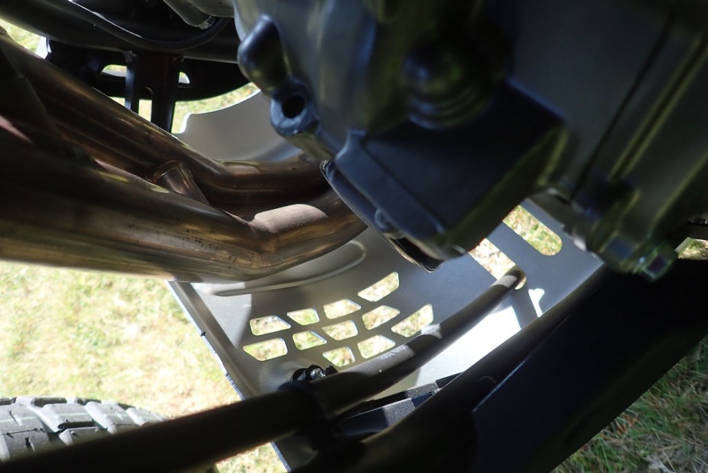 And the 2mm steel and plastic bash plate (right) will merely deflect stones and insects, and underneath has about 1mm of clearance between the cat (a bit more under the offset sump. A thicker plate and guards are on they way.