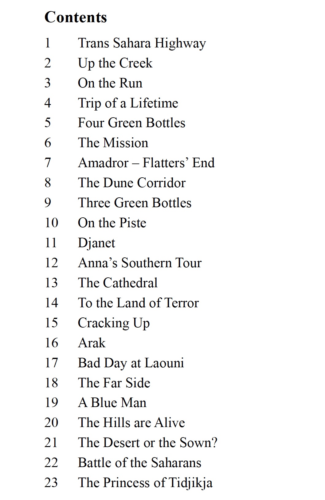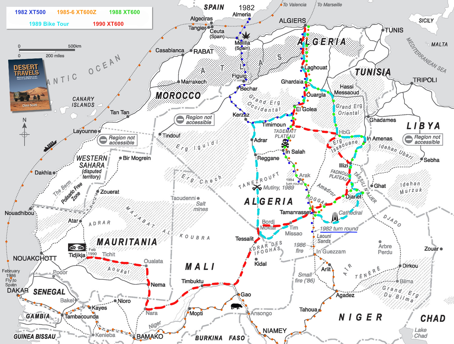 • Then lunges forward to 1989: my month-long Sahara Motorcycle Tour which takes up much of the book. In the course of that account and elsewhere, I frequently spin-off on historical or other excursions.