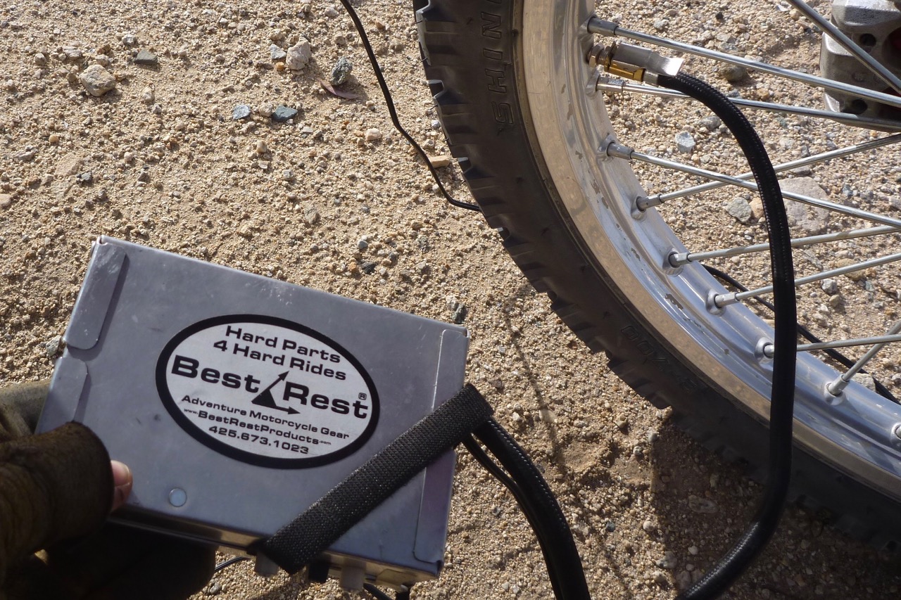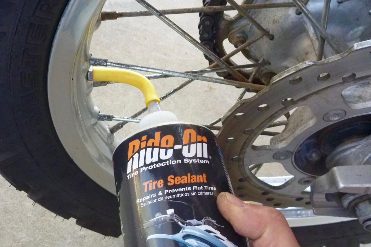 Back at Al Jesse’s compound, his workshop-like garage is bigger than our flat in London, and with record high temps, I took a leisurely couple of days checking the KLX over. The Shinko E700 trail bike tyres were less than half gone so would do. I gave them a shot of sealant; for a tenner it’s worth the gamble (right).