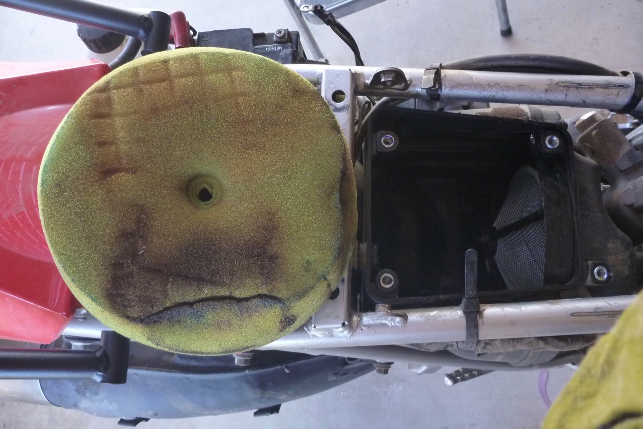 A peep into the airbox revealed what looked like a fat Twin Air foam filter stuffed in there, nicely oiled and clean enough for the moment. Along with the shock links, someone knew their priorities, but it probably wasn’t the seller who’d come out with some cock-and-bull excuses and was probably selling it for someone else.