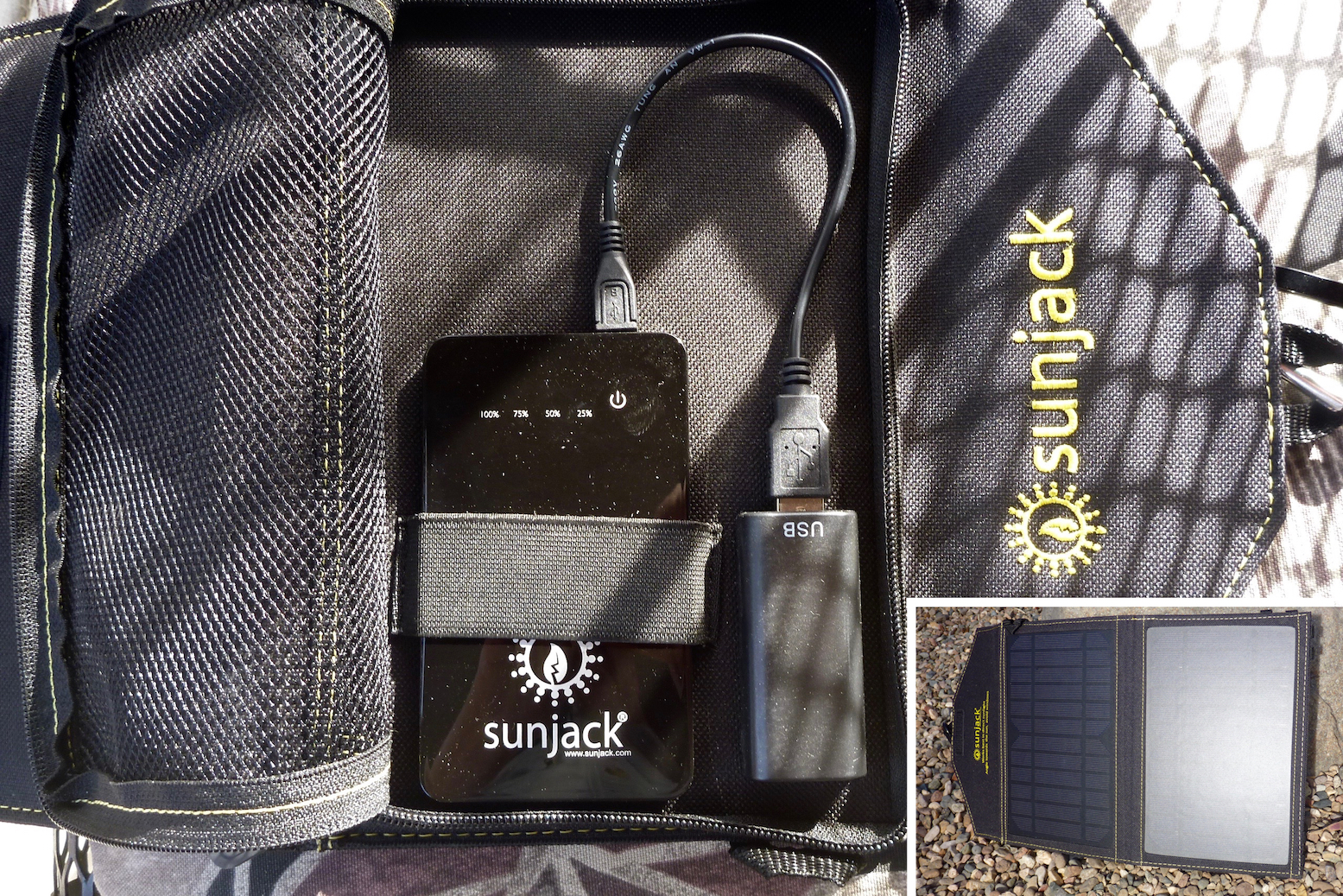 Al was testing a Sunjack solar charger and with storage battery (right), a fold-out unit similar to a Power Monkey, but with ten times more panel area and probably as many years of advances in solar technology. I bought the smallest 7w / 4000mAh for later desert trips. They go from just $50 discounted online.