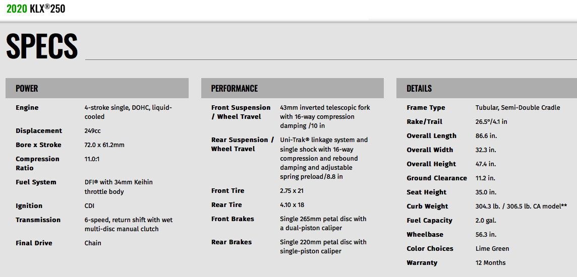 Wet, the KLX250 is about 15kg lighter than the hefty Honda CRF with its road-bike engine; my ’09 carb got up to 88 mpgIMP (73US or 31kpl), that’s about 90% of what my efi Honda managed at backroad bimbling speeds – 65US was more normal. And the stock suspension is a whole lot better, with USDs and fully adjustable damping all-round right out of the crate.