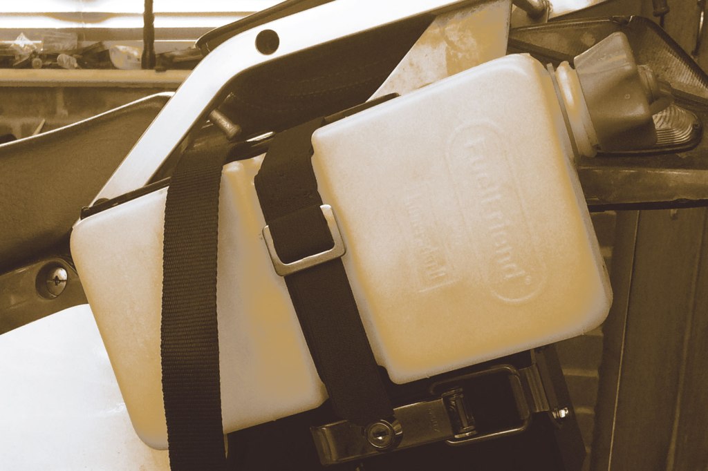 The more-rounded three-litre is a bit harder to fix to a flat surface. Fuel Friends also make a 1.5l can (right) with a waisted profile for secure strapping.