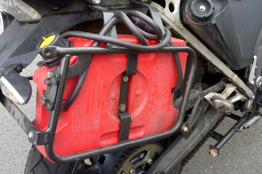 This is by far the cheapest solution. On the KLX, left, with its tiny 7-litre tank, a NoSpill 1.25 US gas can from Walmart (takes 1.5 US or 5.7L) gave me an adequate 200-mile range. I used that can a lot on that trip and the twenty bucks was a lot less than the $275 I could have spent on an IMS tank, gaining only an extra 4.2 litres.