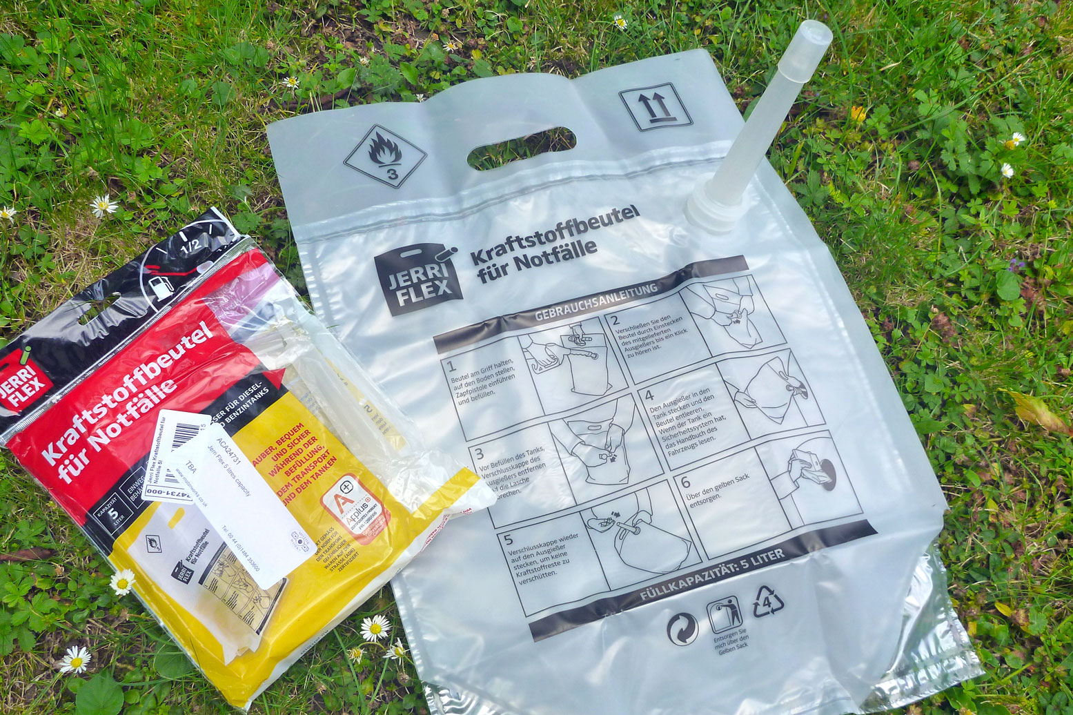 Emergency ‘go-and-get-fuel’ containers can be the use-once 5-litre Wunderlich bag on the right (€9). Or on the left, the simpler 8-litre Jollytank from Italy made in a similar plastic but reusable. It’s sold on ebay.it from around €6. In my opinion, any fuel bag’s minimal useful volume is around 5 litres or at least 100km.