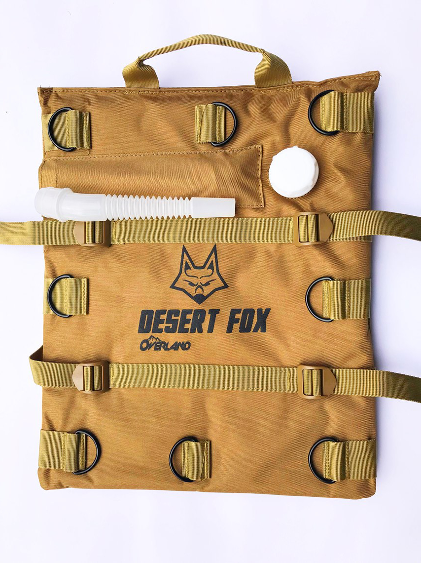 The Desert Fox Bladders are pretty tough on the exterior, the bag holding the fuel is a three walled Plastic Bag encapsulated in a Cordura skin it comes with buckle and strap but those are meant to be used when storing the Bag not fastening it to the Bike. I use the Rox Straps to secure mine on my recent trip in South Africa I used one for water and one for Fuel no issues. One user complained that inner bag tore and he had a tough time getting the fuel out so when Filling it don’t shove the petrol pump nozzle in the bag without inspecting it if it has a sharp edge from being dropped then be extra cautious. I hang it by it supplied Handle from the footpeg when filling them The Aus Made LC bags are a lot tougher but lacks the securing function, there is someone on the ADVRider offering a custom Cordura solution see here http://advrider.com/index.php?threads/custom-sewing-and-cordura-items.487221/page-84