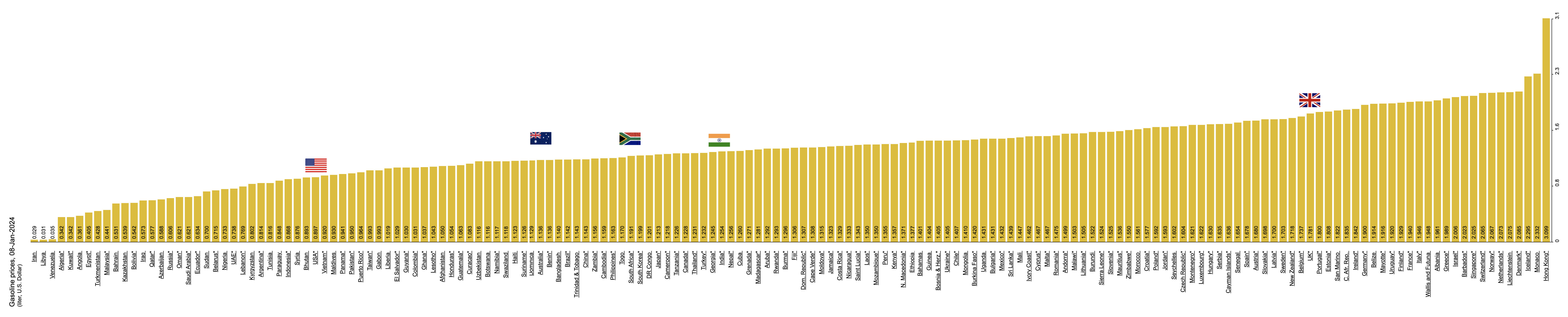 Image below: world fuel prices at this update (source). As always, Iran, Venezuela and Libya barely register, with Hong Kong at over $3 a litre. The cost of crossing some countries will vary greatly, and at some borders it pays to arrive either near-empty or near full.