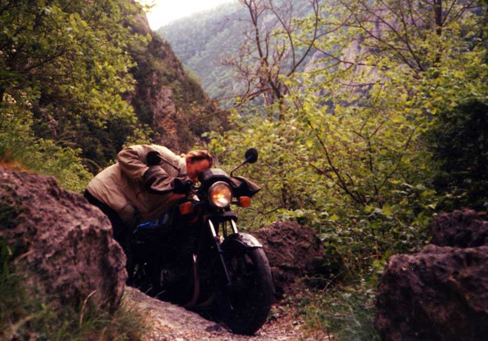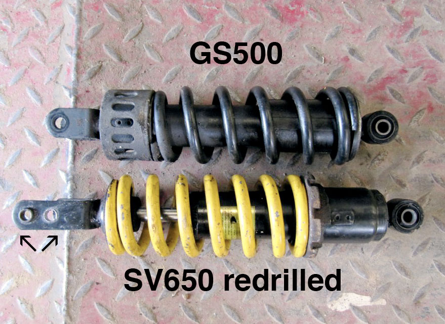 The GS’s modest power gives great economy on its twin carbs (although I’d take efi any day). With good economy there’s no need for giant tanks; with a 10-litre fuel bag I’ll have a potential autonomy of nearly 700km. Used spares for GSs are as cheap as chips, the online GS knowledgebase reaches up to your chin, and now they’ve finished with mine, it’s running a DR650 front end (left), an adapted SV650 shock (right), and identical 19-inch wheels and tyres (right – photoshoppery before suspension mods – see other posts); something you can re-shod in Nepal without calling on DHL.
