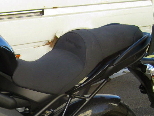 The optional gel seat looked well made, and so it should be, going for well over 300 quid new. But it’s the same stepped shape as the OE unit and once slotted in you’ve no room to move around. There’s talk of the OE seats being terrible but it seems OK to me. Also, I believe that gel may sound cool and techy but has been discredited as a suitable medium for seats. Gel does not compress enough; it merely deforms a little and is too dense to shed heat.