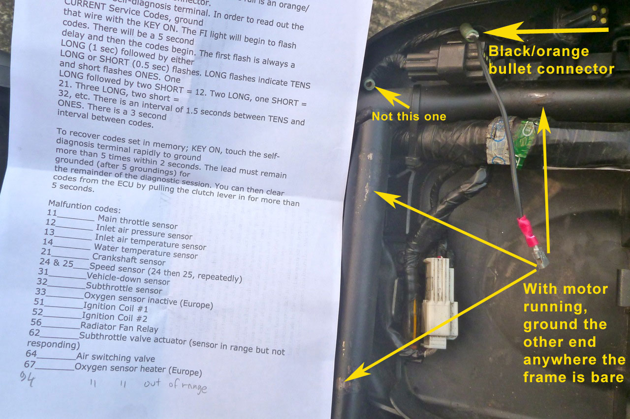 The Versys appears to have an astonishingly user-friendly system where you simply plug in a bit of wire into an unmarked female bullet connector under the seat (see above left) and then, with the engine running, ground the wire anywhere on the frame. A workshop manual may be different, but there’s nothing about any of this in the handbook. Once you ground the wire as instructed, instead of the ECU going BANG! followed by a puff of acrid smoke, the FI light on the dash flashes up a sequence: long = #10, short = #1. Translate those flashing codes and work it out from there. The print out pictured left and the pdf version here are based on posts like this buried on various forums.