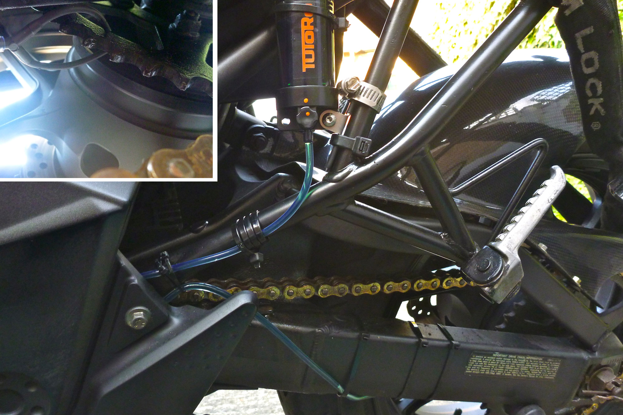 I’m a fan of Tutoro bump ‘n’ pump chain oilers and had one waiting in the wings. This time I knew how to fit the twin-nozzle oil feeder correctly, biting into the rear sprocket (inset, left), and found a tucked in frame rail to mount the reservoir (left). The feed tube routing is not so elegant but it seems to have survived the first tankful. With the adjuster screwed out one turn it’s feeding oil at just the right rate.