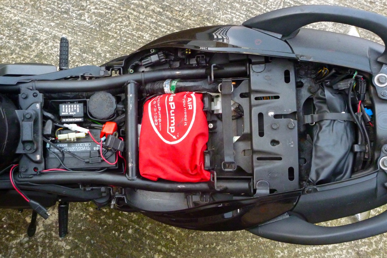 While the seat was off I took the chance to move some chunky space-wasting connectors and big fuses to make room for a Cycle Pump and tubeless repair kit (above right).