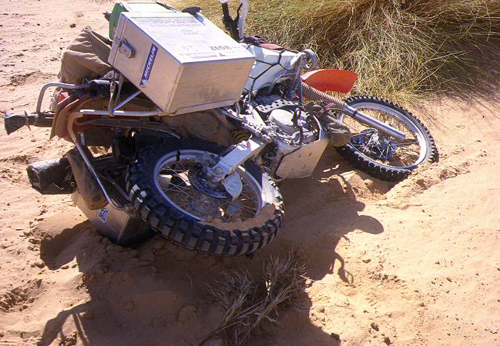 Tyres include Continental’s TKC 80 on the Tenere above, a discontinued Michelin T63 (replaced with Anakee Wild) on the fallen XRL, an original Michelin Desert on the black Tenere below.