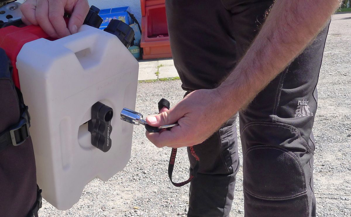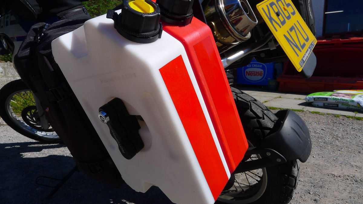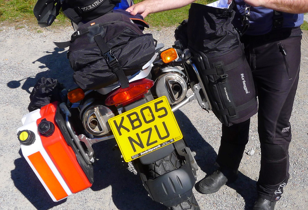 The Kriega platform can be easily adapted to take accessories, most commonly a pair of tough Rotopax rotomolded fuel or water cans at 3.8 litres (1 US gal) each. They lock on with a rotating clamp mount (Kriega accessory) which presses the cans against the rack. All up that’s a weight of up to 11kg on the one-kilo spindle mount, so you’d hope it’s up to a long session of corrugations (which starts me of again on my platform rack preference: separating the location/mounting from load bearing). I must say I prefer bags for water and fuel: they’re lighter and take up less space when not in use, but a rigid fluid container is so much easier to handle than a floppy bag, especially with water which gets more frequent use. (I use a rigid day bottle and keep the mass of water – when needed – in a bag).