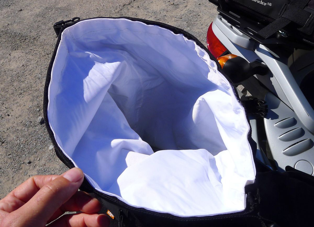 The zipless, roll-top bags themselves use Kriega’s usual 1000D ‘Rhinotek’ Cordura fabric, similar (in appearance at least) to my Magadans. Inside white liners are velcro’d to the top edge of the outer bag. It struck us both that white was a good idea for better visibility when digging around looking for something. And as I mentioned in the Magadan review, removable inner bags are the way to go. The Kriega inner bags are made of something like PU-coated nylon with taped seams, but reassuringly thicker than your average stuff sack and it’s all guaranteed for ten years according to the website. Like I say in the Magadan review, I think PVC- or PU-type fabric with heat- or RF-welded seams (like Ortlieb baggage) would be bomb-proof, high-wear solution for a liner, but it’s less flexible when cold compared to nylon which as a result rolls up tighter and so makes a better seal against water ingress. Nick said he rode through a downpour on the way up which got through his Rukka membrane jacket, but his three Kriega bags survived bone dry.