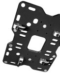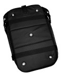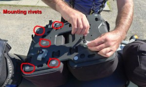 But Nick explained, five screw-and-lock rivets also fix the bags to the plate and help support the weight. The straps do pass through slots in the plates edges but mainly to compress the bag’s load volume. If I understood him right, Nick also mentioned that the tensioning cam buckles pulling into the gap between the bags was awkward, but perhaps the straps can be easily reversed to pull outwards. The rivets screw through holes in the back of outer bag (right) and require an allen key or similar to tighten into place or release. Once fixed on like this, the bags are not easily removed from the plate should you decide to reconfigure your set up. To remove the baggage you remove the entire plate (see below).