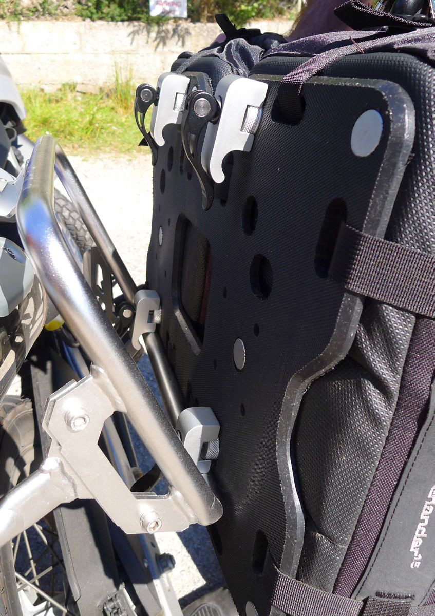 Whether you’re camping or lodging with the Overlanders, you’d probably need to remove them daily (unless you lift out the inner bags) which could get a pain. Removal could be speeded up with only a little loss in solid mounting by replacing the lower lever clamps with fixed, weight-bearing slot-in U-mounts as found on many metal boxes. The use of four fiddly q/r clamps does seem OTT to me** and they’re not actually theft proof either (though that could easily be done by drilling the cam levers to take a thin cable lock). And if you’re removing the plates frequently then a handle across the top cut out (strap or part of the plate) was something they may have missed.