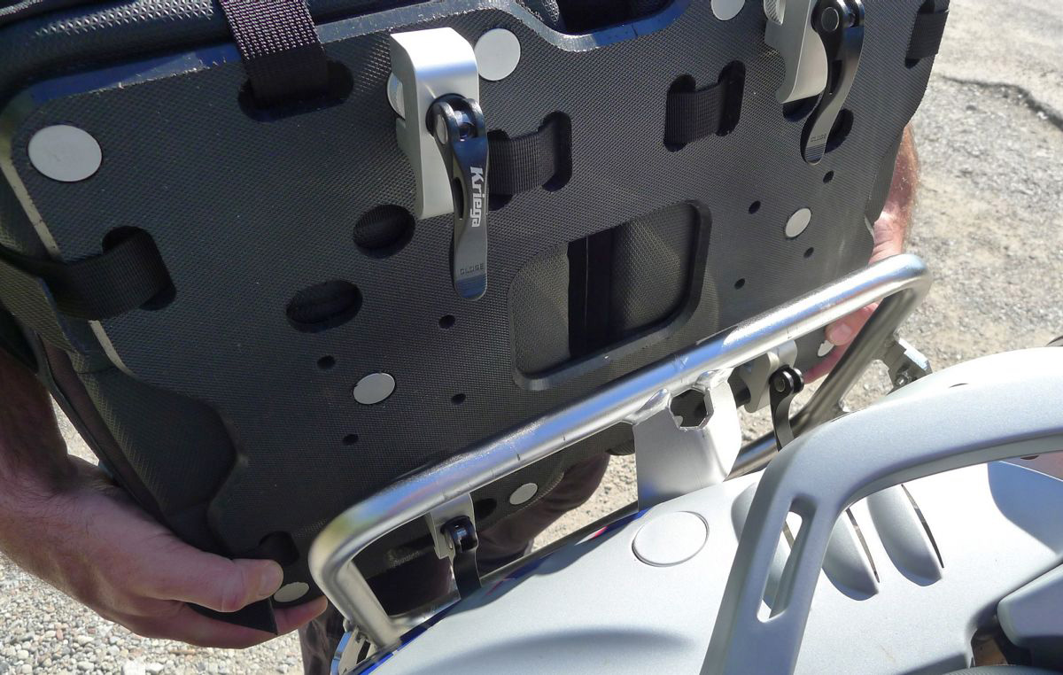 I believe a simple and foolproof but solid mounting system for anything regularly removed from a moving object – moto baggage; crash helmet; running shoes – is important because with anything repetitive you can get both blasé or distracted midway if it takes a while. All the more when it’s not a simple ‘clip on’ procedure when half awake in the morning surrounded by two-dozen spear-wielding tribesmen or a pilfer-prone crowd. While at the other end of the day, when worn out after a tough ride, irrational levels of frustration can be focussed on uncooperative inanimate objects like your baggage, when all you want to do is get inside, fed and rested. Meanwhile, a slick system like Ortlieb’s QL (admittedly not perfect or robust enough for overland moto use) can be a pleasure to use. If it’s also field repairable and secure against opportunist theft, so much the better.